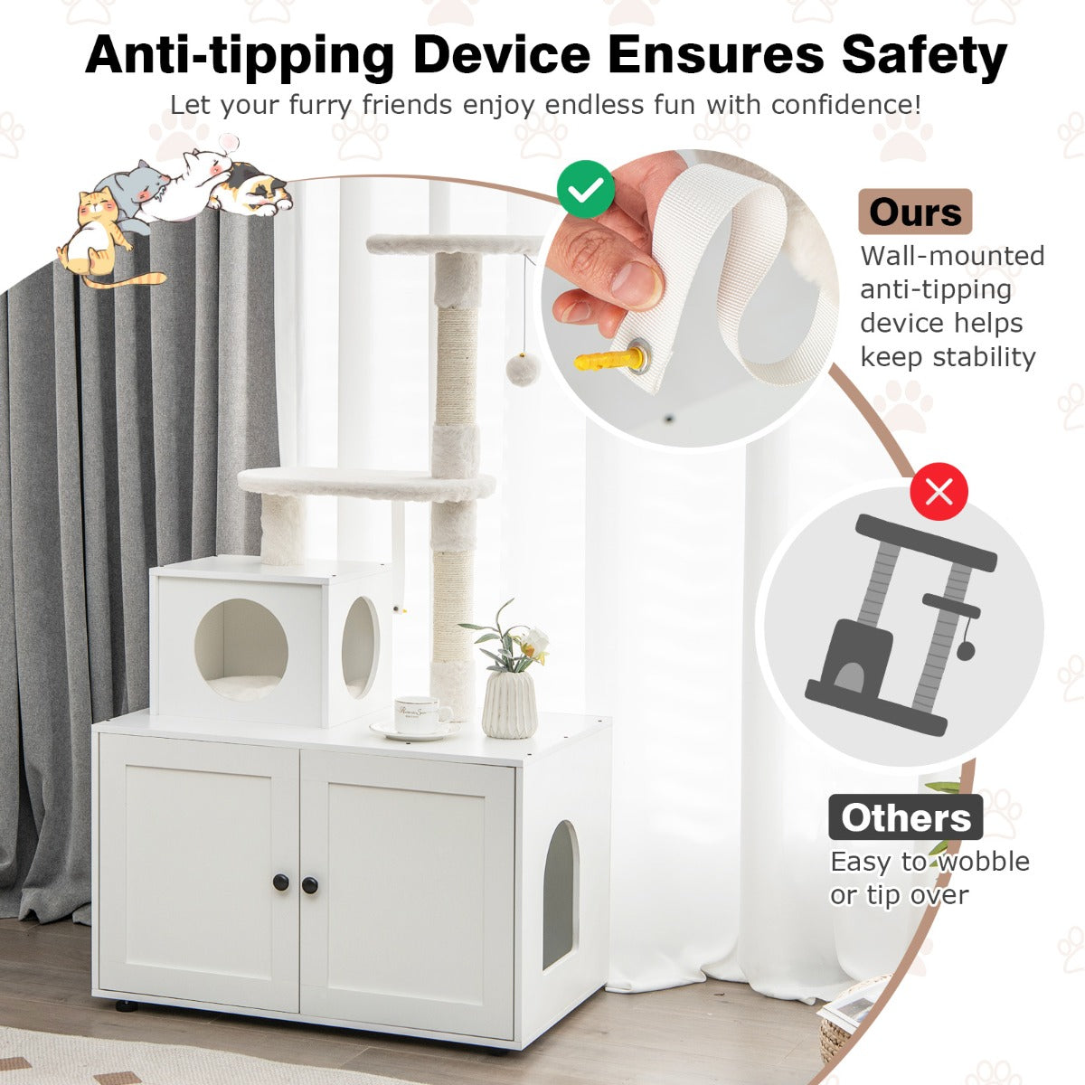 Cozy house for your lovely cats, modern furniture in your home! Why choose our 2-in-1 cat tree? Unlike others, ours comes with a pet-friendly cat litter box enclosure to avoid unpleasant smells and keep a clean inner environment. The hidden cat washroom exists multiple holes to promote air circulation and keep the bright vision. Besides, the bottom cabinet has a compartment to store your sundries or cat foods, thus you can avoid messy rooms. Moreover, a sumptuous cat condo with a soft pad will let your cats sleep comfortably. Besides, hanging teasing balls, top perch and large platforms will provide more activity space for your kittens. Coming with wear-resistant, solid and crack-resistant scratching posts, the multipurpose cat tree is conducive to sharpening cats' paws and protecting your furniture. Equipped with anti-tipping fitting and adjustable feet pads, our cat tree is not easy to wobble or tip over, which will let your furry friends enjoy endless fun with confidence! Bullet Point: Multi-level Cat Tree: With a multi-layer design, the cat tower will provide an ideal place to hold a cat litter box. Meanwhile, it's cat condo and top perch allow cats to rest in comfort. Besides, the plush ball, scratching posts and spacious jumping platform are designed to release your cats' instincts. Large & Functional Cabinet: The bottom cabinet includes a cat litter box enclosure, which offers private potty time for your cats. And a compartment is designed for you to store cat food, toys or other supplies. Moreover, there are large side entries to provide easy access for cats. Safe & Thoughtful Details: The modern cat tree is equipped with a wall-mounted anti-tipping device to keep stability, which is safe for your kids and pets. Additionally, adjustable foot pads will avoid wobbling on uneven floors. And the cat cabinet is designed with air vents to reduce odours. Sturdy Modern Furniture: Our cat tree with litter box enclosure is made of premium MDF, which is sturdy and durable. In addition, the realistic wood grain finish makes this indoor cat tree easy to complement your various home decor. Comfortable & Easy to Clean: The 2-in-1 cat tower comes with a soft padded removable mat, which is washable for easy cleaning. Meanwhile, it will provide a gentle touch to soothe cats' fatigue and bring comfort. Features: Deluxe cat condo with soft cushion provides upgrade coziness A hidden cat washroom is great to hide cat litter box Multiple large entries are designed to provide easy access for cats 17 cm natural sisal scratching posts will save your furniture from sharp paws Hanging teasing ball and jump platform offer endless fun The all-in-1 design allows cats to rest, play and poop in an ideal space Included anti-tipping device ensures the safety Adjustable feet pads keep the cat tree stable on uneven grounds Magnetic door catch enables the door to be closed firmly Double door with knobs is easy to open and close A waterproof surface is easy to maintain with a wet cloth Specifications: Colour: Rustic Brown/White Material: MDF, Engineering Board, Sisal, Plush Fabric Overall Dimensions: 77.5 x 49 x 132 cm Size of the Cat Litter Box Enclosure: 77.5 x 49 x 48.5 cm Size of the Interior: 51.5 x 46.5 x 44.5 cm Size of the Cat Condo: 34 x 30 x 26 cm Weight Capacity of Each Tier: 20 kg Total Weight Capacity: 80 kg Net Weight: 18.5 kg Package Includes: 1 x Cat Litter Box Enclosure with Cat Tree 1 x User's Manual Box Qty:1(May vary by batch)